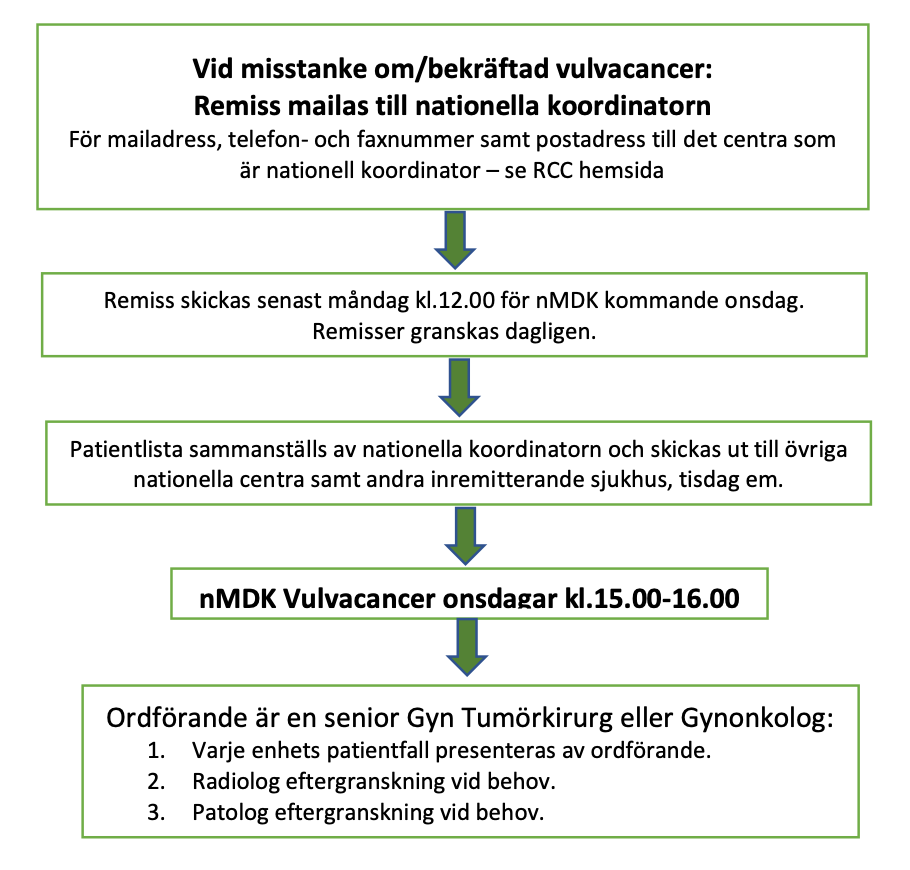 Sedan januari 2017 är all vulvacancerbehandling centraliserad till 4 nationella centra: Göteborg, Linköping, Lund och Stockholm. De fyra centra sammanträder varje vecka vid den nationella multidisciplinära videokonferensen (nMDK).
